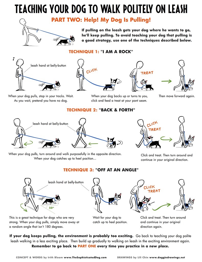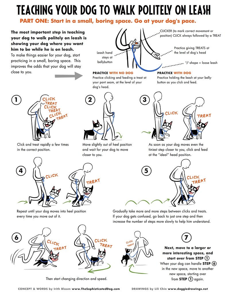 Now that you're familiar with the basic concepts for both ends of the leash, it's time to formalise these concepts and practise walking around your classmates. Be sure to bring a large quantity of treats, both to class and on real-life walks: your puppy's dinner plus a handful of meat or cheese works well. Educational dog artist Lili Chin shows it better than words alone: